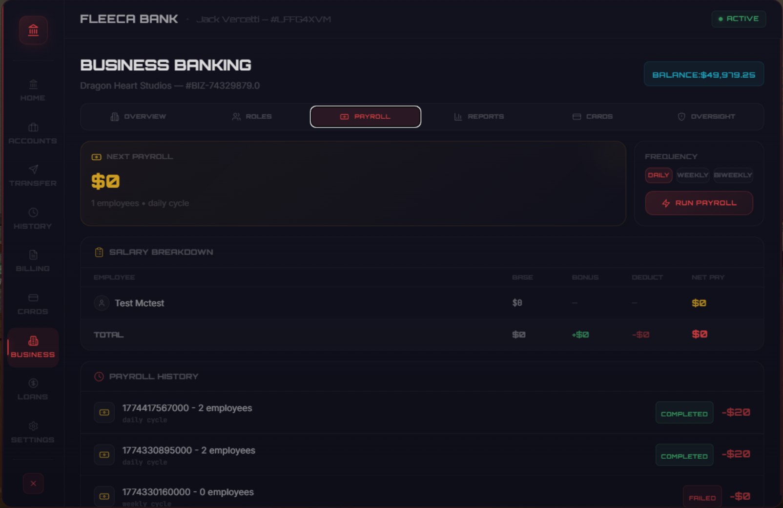 Every deposit, withdrawal, transfer, payment, and payroll action is logged with timestamps, descriptions, and amounts. Players can review their financial history at any time, creating a paper trail for investigations, disputes, and roleplay.