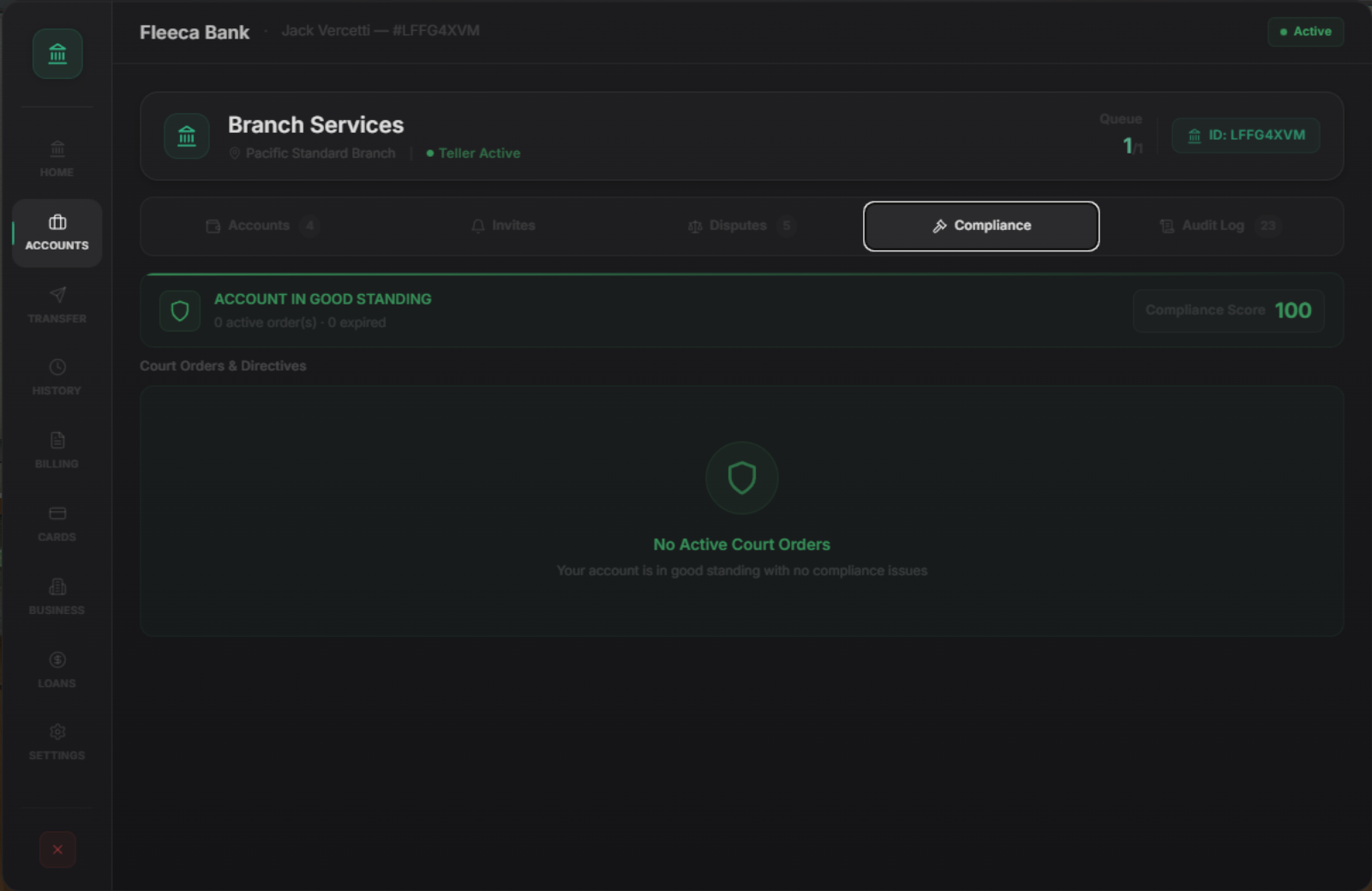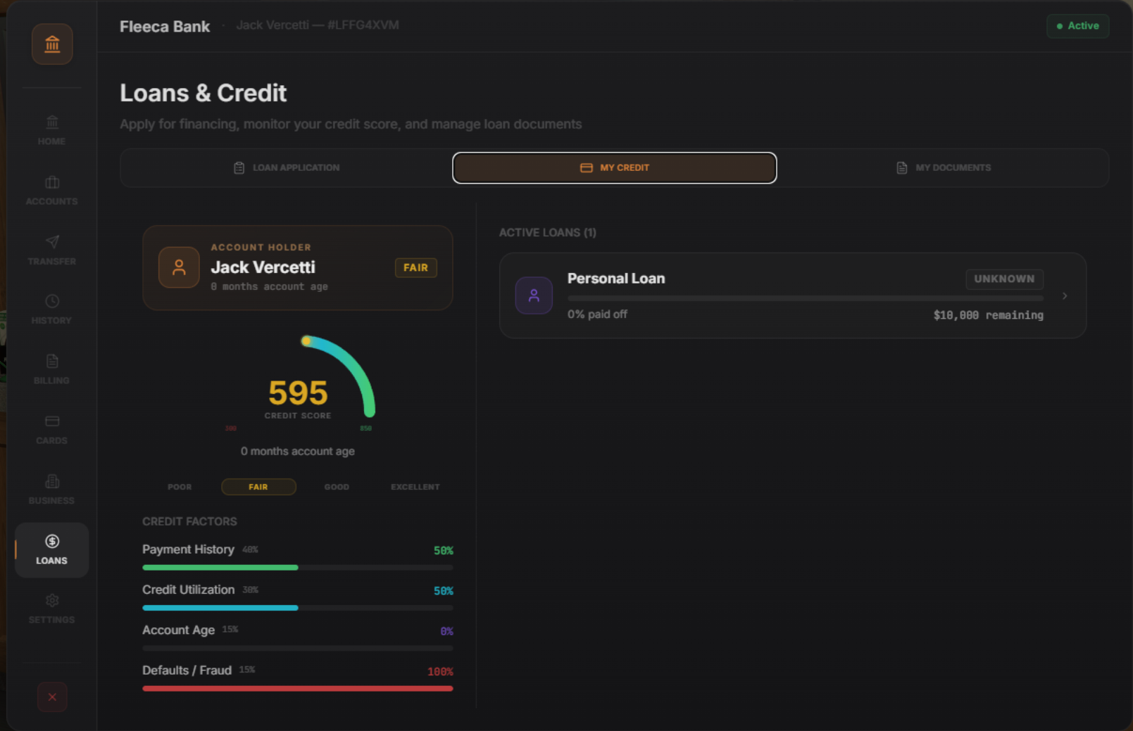 View balances, recent transactions, credit score, active loans, cards, and account history all from one clean dashboard.