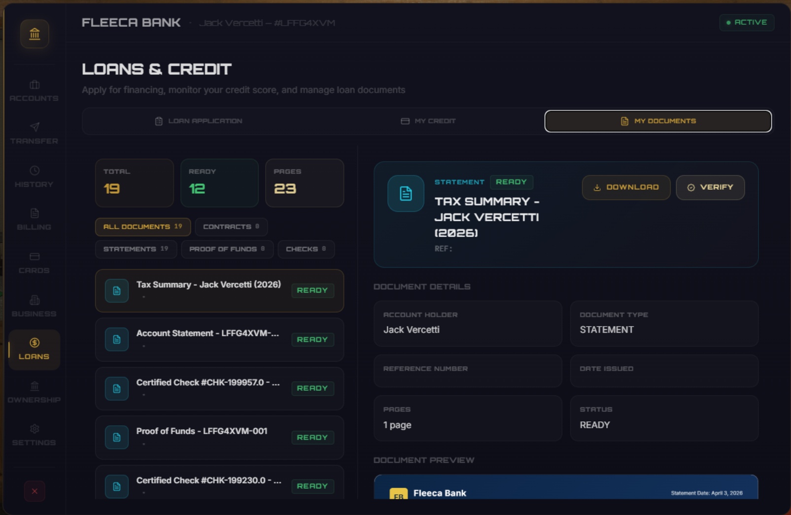 Generate statements, tax summaries, proof-of-funds letters, and certified checks.